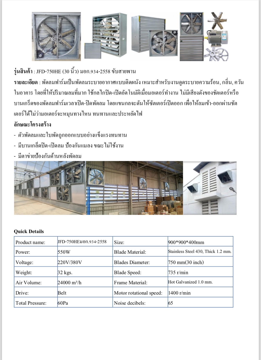 มาสเตอร์แฟน ซัพพลาย แอนด์พาร์ท จำหน่าย พัดลมฟาร์ม 30 นิ้ว เป็นพัดลมระบายอากาศแบบติดผนัง รุ่น JFD-750HE